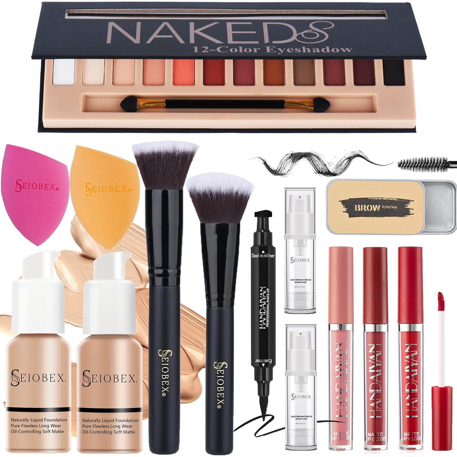 SEIOBEX All in One Makeup kit for Women Full Kit with Blending Brush, 12 Colors Eyeshadow Palette, Liquid Lipstick Kit, Sponge, Eyebrow Soap, Foundation, Primer, Sponge, Eyeliner Stamp - 14 in Pack