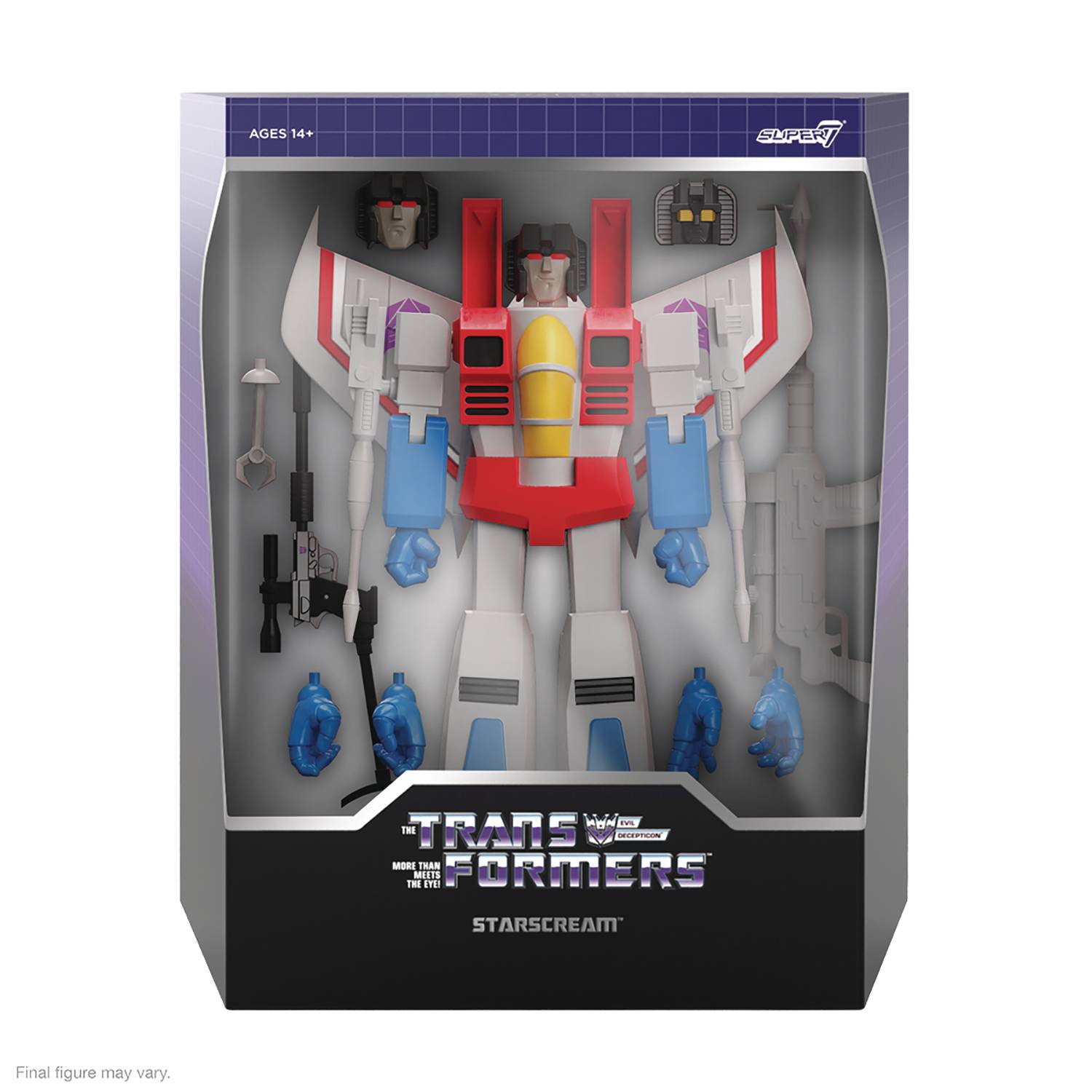 From Super7. With teammates like Starscream, who needs enemies? Treacherous, power-hungry, and ambitious, Starscream often manages to sabotage Decepticon plans in pursuit of his own agenda. This 7" scale highly articulated, intricately detailed Transformers ULTIMATES! figure of Starscream is inspired by its G1 appearance and comes with multiple interchangeable heads & hands as well as a variety of accessories, including an Energon cube and Megatron gun.