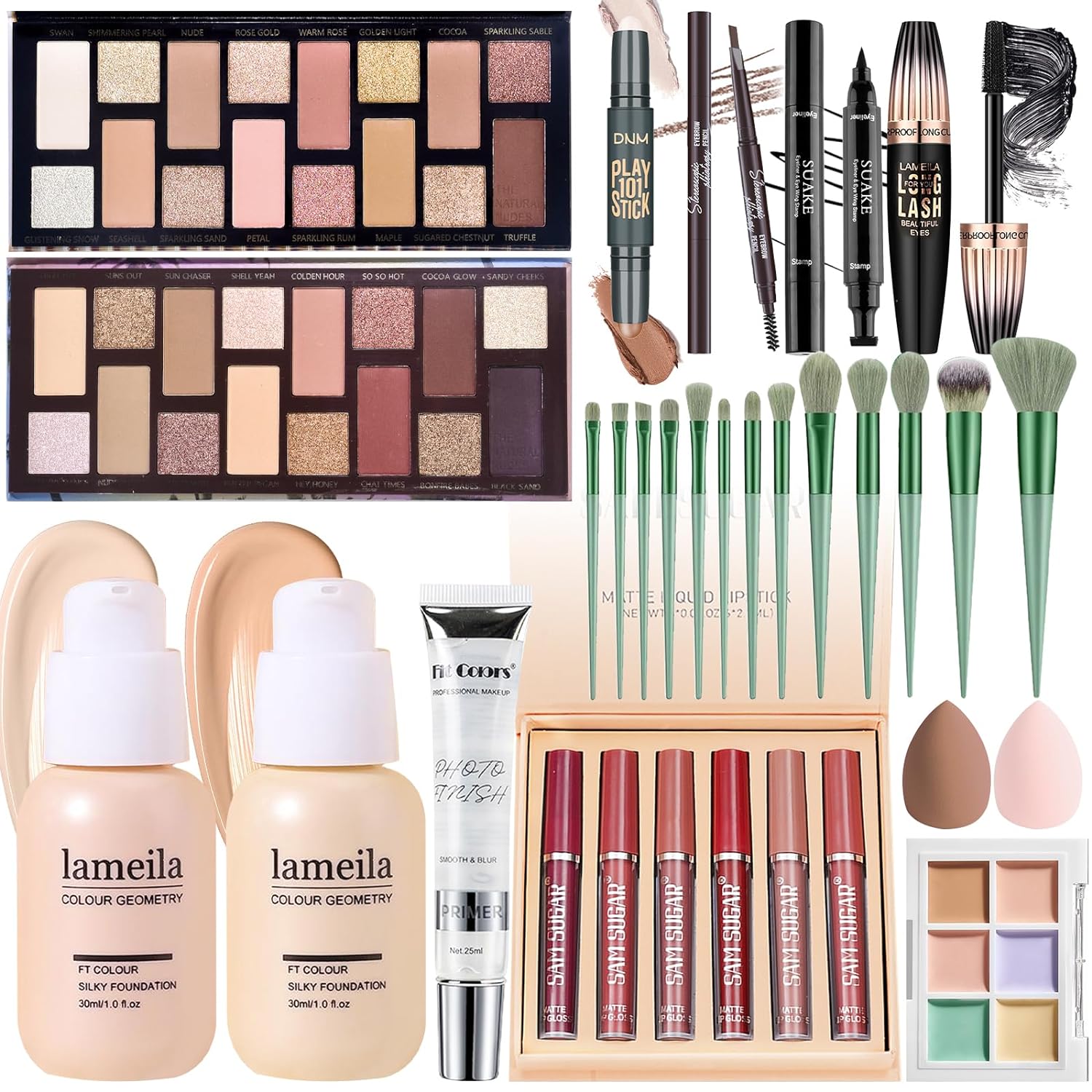 [Multipurpose Makeup Set] The all-in-one makeup kit contains a wide variety of shades and styles. The cosmetics includes 32 colors matte and shimmer eyeshadow palette, full coverage natural & buff beige foundation, face primer, 6 color correcting palette, dual-ended highlighter & counter stick, 6 color matte velvet liquid lipsticks, eyebrow pencil, winged eyeliner stamp, waterproof mascara, 13 pcs makeup brush set & 2 makeup sponges.