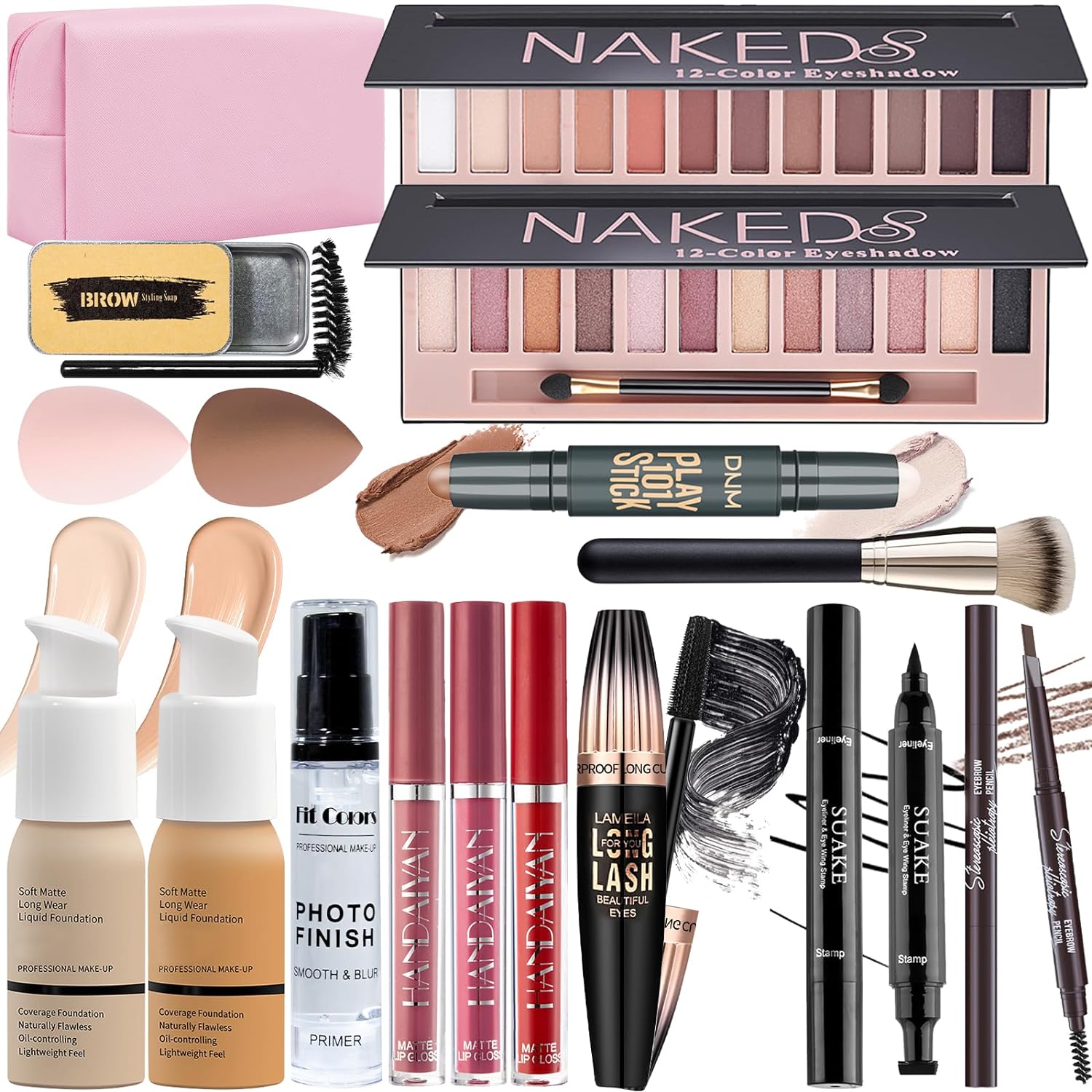 [All In One Makeup Set] The multipurpose makeup gift set for women includes Full Coverage Nude & Buff Beige Foundation, Matte & Shimmer 12 Colors Naked Eyeshadow Palette, 3pcs Liquid Lipsticks, Face Primer, Dual-Ended Counter Stick, Waterproof Cosmetic Bag, Eyebrow Soap set, Dual-ended Eyebrow Pencil, Winged Eyeliner Stamp, Waterproof Mascara, Makeup Brush & 2PCs Makeup Sponges. It can meet all the beginners’ or professional makeup artists’ needs for daily makeup.